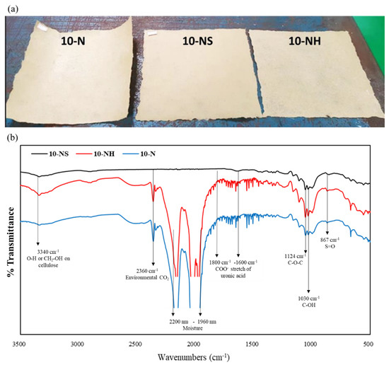 (a) Visual appearance and (b) FTIR spectra of Rhizoclonium pulp samples prepared using 10-N, 10-NH, and 10-NS cooking treatments in handsheets.