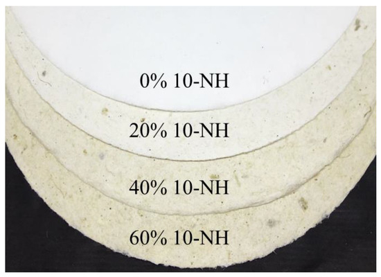 Visual appearance of 0%, 20%, 40%, and 60% 10-NH mixed pulp handsheets.