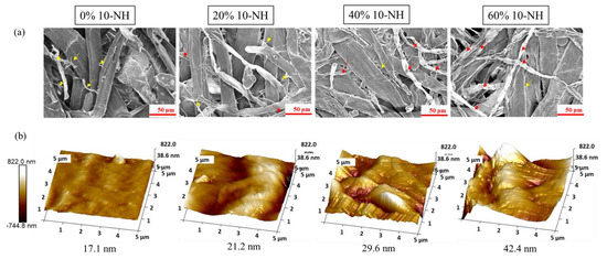 (a) SEM and (b) AFM images with average roughness values for 0%, 20%, 40%, and 60% 10-NH mixed pulp handsheets (red arrow: 10-NH algal fiber; yellow arrow: microfibrils of wood fiber).