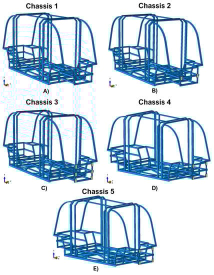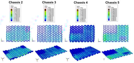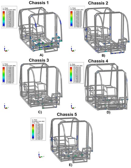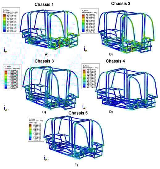 Comparison in terms of Von Mises’s stress. (A) Chassis 1, (B) Chassis 2, (C) Chassis 3, (D) Chassis 4, and (E) Chassis 5.