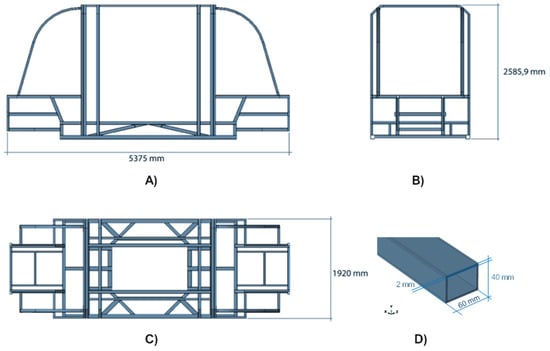 Geometrical dimensions of the chassis. (A) lateral view, (B) frontal view, (C) top view, and (D) detail of the frame component.