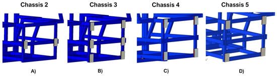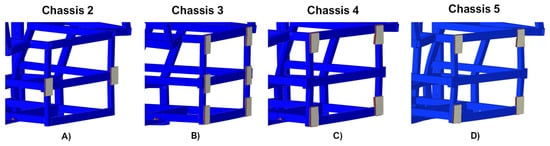 Chassis 4 includes a damping system with the same mass as the one introduced in Chassis 3, but composed of only four absorbers. In this configuration, the shock absorbers are placed only in the corners of the structure’s frontal section. However, each absorber is 23 mm high. The mass of this damping system is 0.792 kg (Figure 1D).