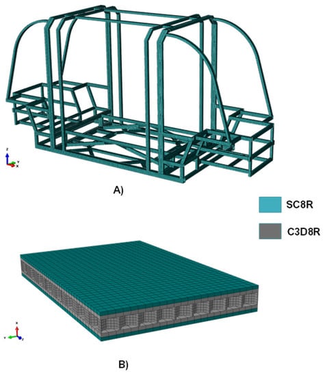 The mathematical approach employed for the development of FE models is based on a detailed formulation with three-dimensional finite elements. In particular, as indicated in Figure 5, the chassis structure was discretised using SC8R elements (coloured in green), while, for the shock absorbers, C3D8R (coloured in grey) elements were selected for the polymer component and SC8R elements for the external composite skins.