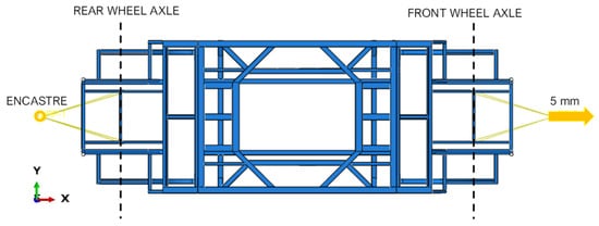 The mesh sensitivity analysis proves that a discretization of the chassis with elements smaller than 10 mm does not provide an improvement in the solution, since from this element size the stress stabilises at 127 MPa. However, as shown in Figure 7B, there is a significant increase in computational time when the chassis is discretized with elements smaller than 10 mm. Therefore, 10 mm element size dimension has been selected to discretize the chassis. This finite element dimension overcomes the hourglass problems to which these reduced-integration elements are subject.