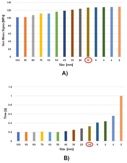 Finite element discretization. (A) Histogram graph of stresses as a function of element size; (B) Histogram graph of calculation time as a function of element size.