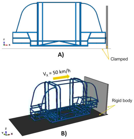 To perform the crash test analyses, the reference points of both the road and the rigid wall have been clamped, while a 50 km/h initial velocity has been assigned to the chassis in the x-positive direction, according to the full-frontal crash test standard of Euro NCAP and to the maximum speed achievable by the minibus due to design constraints. Moreover, a gravity load is also defined by assigning the gravitational acceleration in the vertical direction to the whole model and considering the density associated with the materials, in order to take into account the gravitational effect as well.