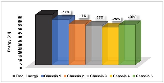 Figure 12 compares the percentage of total energy transferred in the safety cage (which is the most critical area of the frame) between the explored configurations. This graph shows that by integrating shock-absorbing systems at specific points in the chassis, it is possible to reduce the percentage of impact energy transferred to the safety cage up to 25%. Specifically, for the Chassis 1 configuration, the total energy transferred in the safety cage is 90%, for Chassis 2 it is 81%, for Chassis 3 it is 78%, while in Chassis 4 and Chassis 5 configurations it is 75% and 80%, respectively.