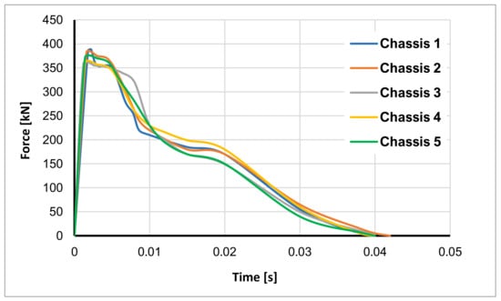 Indeed, by comparing the curves on the force–time graph, it can be seen that by introducing the shock-absorbing systems, the peak force decreases. This is most evident when comparing the undamped Chassis 1 configuration with the Chassis 3 and Chassis 4 configurations, where the peak force is reduced by approximately 30 kN. Moreover, it should be also noted that in the first interval time, the blue curve of the Chassis 1 configuration exhibits a sudden collapse. This is because there is no damping and the phenomenon immediately triggers the catastrophic failure of the structure. This is prevented equipping the damping systems. Indeed, all shock absorber reinforced arrangements assume a horizontal trend, since the damping systems confers to the assembly the capability to dissipate impact energy by means of plastic deformation of the shock absorbers’ core and intralaminar cracking of the composite skins. These effects (maximum peak force reduction and peaks damping in horizontal trend) significantly improve the crashworthiness of the structure, resulting, in practical terms, in a reduced perception of impact acceleration by the passengers and therefore an increase in their safety and comfort.