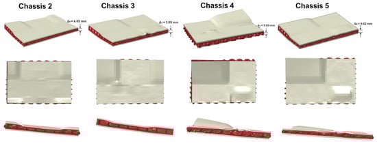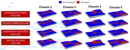 The greatest amount of intralaminar damages occurs in Chassis 2 and Chassis 5 configurations. Indeed, by comparing the shock-absorbing systems of these two configurations with the one present in Chassis 3, it is evident that in these two cases the impact loads are distributed over a smaller surface area before being propagated over the chassis. This is because Chassis 3’s shock-absorbing system is composed of the maximum number of six shock absorbers, while in these two cases the absorbers are two and four, respectively. On the other hand, conducting the same comparison with Chassis 4, it appears that the intralaminar damages of Chassis 2 and Chassis 5 (but also Chassis 3) are greater. This can be explained because in Chassis 4’s set-up, there is a greater thickness of the plastic core that induces the dissipation of the impact energy mainly through plastic deformations.