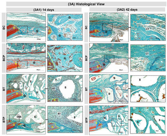 - Biguetti, C.; Cavalla, F.; Tim, C.; Saraiva, P.; Orcini, W.; de Andrade Holgado, L.; Rennó, A.; Matsumoto, M. Bioactive Glass-Ceramic Bone Repair Associated or Not with Autogenous Bone: A Study of Organic Bone Matrix Organization in a Rabbit Critical-Sized Calvarial Model. Clin. Oral Investig. 2018, 23, 413–421. [Google Scholar] [CrossRef]