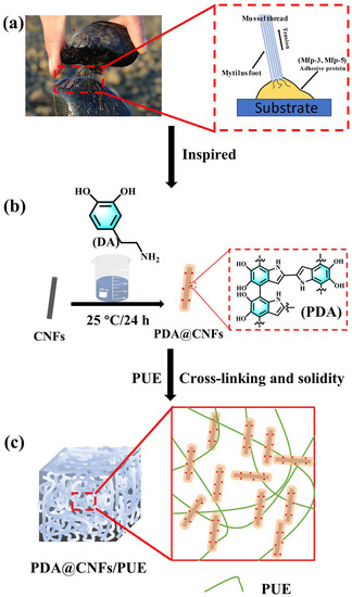 (a) Mechanism of mussel adhesion proteins, (b) synthesis of PDA@CNFs, (c) schematic diagram of PDA@CNFs/PUE covalent and non-covalent conjunction with PUEs.