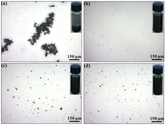 Optical microscope and macroscopic image of nanofillers dispersing in ethanol solution after 10 min ultrasonic and setting for 10 days. (a) CNFs, (b) PDA@CNFs–1, (c) PDA@CNFs–2, (d) PDA@CNFs–3.