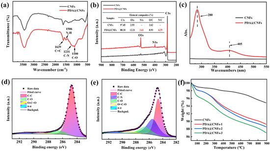 (a) FT-IR spectra of CNFs and PDA@CNFs, (b) XPS full scanning spectra and the element content of the nanofillers, (c) UV-VIS spectra of PDA@CNFs and CNFs, C1s spectra of (d) CNFs and (e) PDA@CNFs, (f) TGA spectra of CNFs and different concentration gradients of PDA to modified CNFs.