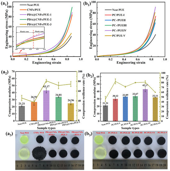 Considering that PUEs exhibit obvious viscoelasticity and viscoplasticity during the compression process, it is necessary to study the compression modules and the compression resilience rate to indicate their strength and toughness [1,43]. It can be seen from the initial stage that the stress–strain curve is linear, and the corresponding slope corresponds to the compression modulus, also known as the elastic modulus (see Figure 5a1). Figure 5 shows the stress–strain curve, compression modulus and compression resilience rate after compression test of PUE composites. There is no obvious deformation and damage of PCs/PUEs after experiment, while CNFs/PUEs and the neat PUEs display serious irreversible deformation and failure.