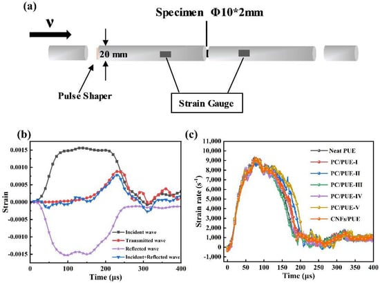 (a) SHPB apparatus schematic diagram, (b) raw data for SHPB calibration, (c) the strain rate of PUE composites after SHPB impact.