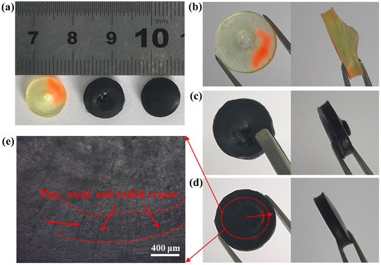 (a) Pictures of neat PUE, CNFs/PUE and PC/PUE-Ⅳ after SHPB test (from left to right), magnified pictures of (b) the neat PUE, (c) CNFs/PUE, (d) PC/PUE–Ⅳ. (e) Optical microscope image of PC/PUE–Ⅵ.