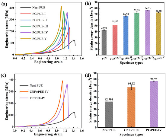(a) Stress–strain curve of PUE composites in SHPB test. (b) Strain energy density value of dynamic impact tests of PUE composites, (c) Dynamic impact test stress–strain curve of PUE, 1.0% wt.% CNFs/PUE and PC/PUE–Ⅳ, (d) Strain energy density value of dynamic impact tests of neat PUE, CNFs/PUE and PC/PUE–Ⅳ.