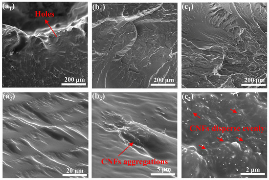 The microtopography of nanofillers can be observed by SEM and TEM. Figure 4 shows the surface morphology of CNFs and PDA@CNFs–1. There are 2 nm holes in the CNFs (see Figure 4a3). Compared with the smooth surface of CNFs (see Figure 4a), the surface of PDA@CNFs–1 (see Figure 4b) is rougher and thicker, and is wrapped by PDA. The thickness of coating on the surface of PDA@CNFs–1 is about 5 nm.