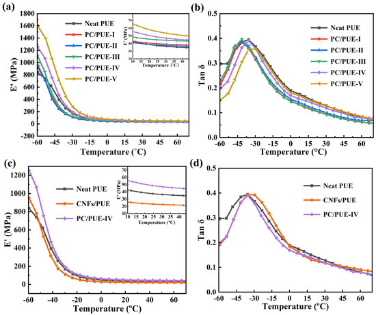 (a) E’ and (b) Tan δ as a function of temperature for Neat PUE and PDA@CNFs/PUE, (c) E’, and (d) Tan δ as a function of temperature for Neat PUE, CNFs/PUE, and PC/PUE–Ⅳ.