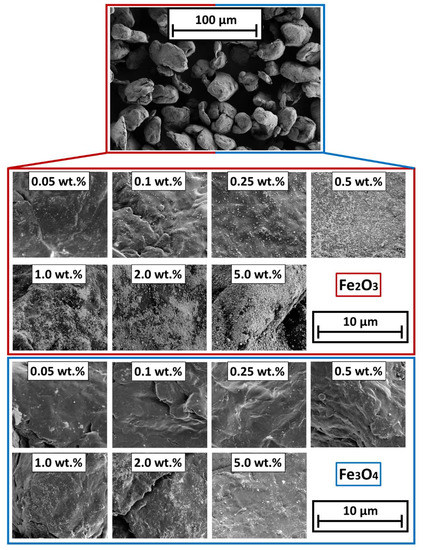 The effect of dry coating can be observed visually in Figure 3. The surface coating noticeably changes the color of the powder to the color of the iron oxide used. Inside the red box (top row), the powders functionalized with Fe2O3 are displayed; in the blue box (bottom row) results of functionalization with Fe3O4 are displayed.