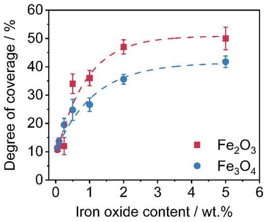Corresponding to the SEM-images from Figure 5, the degrees of coverage (see Figure 4) are determined. Image analysis via MATLAB, due to binarization of the SEM images by use of Otsu’s method [65] to determine the threshold. After binarization, the guest particles are displayed in white and the polymer surface is displayed in black. The degree of coverage is the amount of white area within the image. It is easy to observe that the degree of coverage increases continuously and flattens around 2 wt.% additive content onwards. The lower degree of coverage of the Fe3O4 samples is also evident here. The higher degree of coverage when using the γ-Fe2O3 is related to the easier deagglomeration of the commercial product. The Fe3O4 particles from our own production, were hydrophobized by the oleic acid but not functionalized against aggregation. Results indicate that the interparticulate forces between the Fe3O4 primary particles are stronger than the forces needed to deagglomerate them sufficiently during the coating process, leading to a non-ideal coating result and even spread on the HP surface.