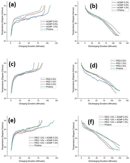 | Composition | 0.3 wt% ACMPs | 1 wt% PEG | 0.5 wt% ACMPs, 1 wt% PCM | |