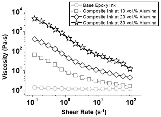 Viscosities of uncured base and alumina-suspended (10–30 vol.%) epoxy inks, measured using rotational viscometry within applied shear rate range between 0.1 and 100 s−1.