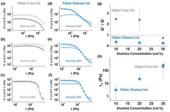Representative elastic (, filled) and viscous (, empty) moduli of water-free epoxy–alumina inks (gray circles) with alumina concentration of (a) 10, (b) 20, and (c) 30 vol.% and those of water-stained inks (blue stars) with alumina concentration of (d) 10, (e) 20, and (f) 30 vol.% and a fixed water concentration of 3 vol.%, as functions of applied shear stress () in oscillatory measurements (at 1 Hz) using a stress ramp. (g) Initial and (h) yield stress (y) values for water-free (gray circles) and water-stained (blue stars) inks. Data in (g) and (h) are averaged values for the results from at least three independent measurements, which are described as functions of alumina concentrations.