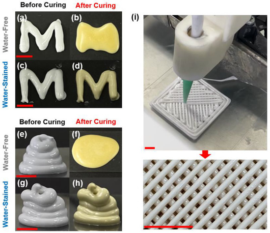 Photographs of hand-extruded letter “M” ((a–d)) and 3D architectures with arbitrary shapes ((e–h)), using water-free epoxy–alumina ink before (a,e) and after (b,f) thermal curing, and using water-stained ink before (c,g) and after (d,h) thermal curing. (i) Demonstration of instrument-assisted 3D printing using water-stained ink (top) and a magnified photograph of cured product (bottom). Fixed alumina concentration of 30 vol.% was used for all samples. For water-stained ink, a fixed water concentration of 3 vol.% was used. Red scale bars are 5 mm.