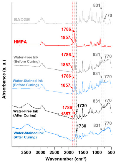 FTIR spectra for BADGE, HMPA, uncured epoxy−alumina inks without and with added water at 3 vol.%, and cured epoxy−alumina inks without and with added water at 3 vol.%. Fixed alumina concentration of 30 vol.% was used for all uncured and cured composite inks.