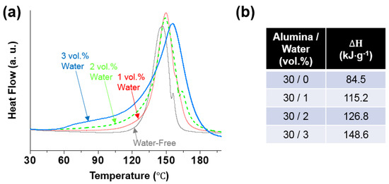 (a) DSC curves for uncured water-stained epoxy–alumina inks at fixed alumina concentration of 30 vol.% with various water contents (0−3%). (b) Total enthalpies (H in kJg−1) during heating, obtained from DSC measurements.