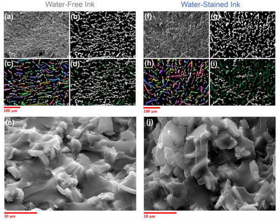 Raw and processed SEM images of cured water-free (a–e) and water-stained (3 vol.%, f–j) inks. Raw images at different magnifications are (a,e,f,j). Representative edge segments from raw images (a,f), detected by computer vision, are represented in (b) and (g), respectively. First eigenvectors for exported edge segments in (b) and (g) are represented in (c) and (h), respectively. CS values of first eigenvectors in (c) and (h) are represented as colors, with green (close to 1, vertical) and white (close to 0, horizontal), in (d) and (i), respectively.