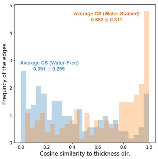 Cosine similarity distributions for all detected edge segments from SEM images in Figure 7a,f.
