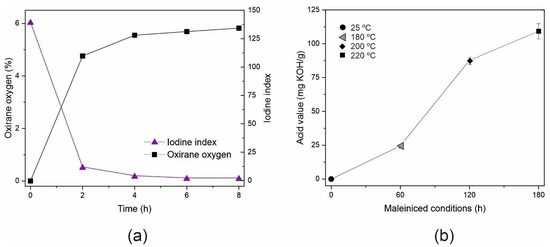 Figure 2b shows the evolution of the acid number values at the end of each one of the stages at different temperatures, namely 180, 200, and 220 °C. Initially, the AV is 0.15 mg KOH g−1 and at the end of the first hour at 180 °C, it is observed that it increases up to 24.4 mg KOH g−1, indicating that the maleinization reaction is occurring. After the second hour, at 200 °C, another large increase is observed, reaching an AV of 87.8 mg KOH g−1, and finally, after the last stage, at 220 °C, the AV reaches 109.2 mg KOH g−1. These results are in total agreement with values obtained by A. Perez-Nakai et al. with an AV of 105 for the maleinized hemp seed and 130 for the maleinized Brazil nut at the end of the epoxidation process [67]. In addition, Quiles Carrillo et al. indicated that commercial-grade maleinized linseed oil has an AV of between 105 and 130 mg KOH g−1 [77].