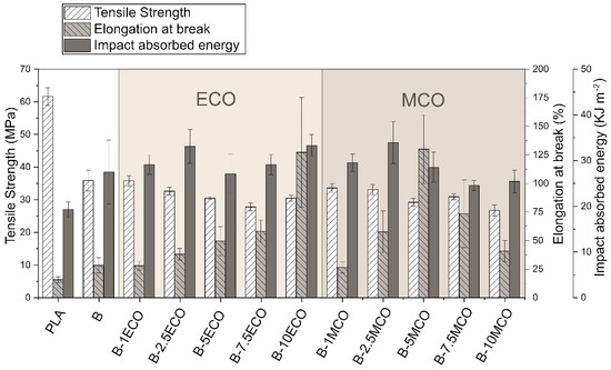 PLA is a brittle material, and with the intention of improving this characteristic, mixtures were made with PHB. Moreover, different percentages of MCO and ECO were used as plasticizers and compatibilizers. The tensile strength, elongation at break and impact absorbed energy values of the studied materials are represented in Figure 3 and the results obtained in the flexural characterization and Young’s modulus and toughness modulus are represented in Table 2. It is observed that, when mixing 25% of PHB with PLA, the strength properties such as tensile and flexural strength, Young’s modulus, and flexural modulus are considerably reduced and ductile properties such as elongation at break and impact absorbed energy are improved [78]. By incorporating ECO in the PLA–PHB blend, the tensile and flexural strength decrease slightly with respect to the PLA–PHB blend and the ductile properties increase as the amount of ECO in the system increases, achieving an elongation at break of 127% when incorporating 10 phr of ECO, which is 450% more elongation compared to the PLA–PHB blend and 810% more compared to PLA. The impact absorbed energy and toughness modulus also increases when incorporating ECO, achieving the best result with 10 phr of ECO. The behavior of the materials when incorporating MCO is similar, however, the tensile strength value decreases to a lesser extent when incorporating ECO, and it remains between 30 and 33 MPa with amounts lower than 7.5 phr of MCO and the flexural strength values are also slightly higher when incorporating ECO. In addition, it is also observed that the ductile properties increase only up to 5 phr of MCO, and at higher amounts, both the elongation at break and the impact absorbed energy decrease. The B-5MCO material has similar mechanical properties to B-10ECO with an increase in elongation at break of approximately 460% more than PLA–PHB blends and 830% more than PLA.