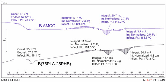 Calorimetric graphs of samples B (PLA–PHB) and B-5MCO.