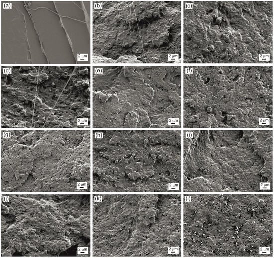 FESEM images at 2500× of fracture surface of (a) PLA; (b) PLA–PHB blend (B); (c) B-1ECO; (d) B-2.5ECO; (e) B-5ECO; (f) B-7.5ECO; (g) B-10ECO; (h) B-1MCO; (i) B-2.5MCO (j) B-5MCO; (k) B-7.5MCO; and (l) B-10MCO.