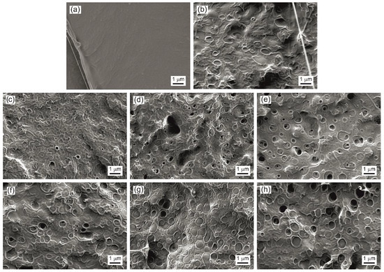 FESEM images at 10,000× of fracture surface of (a) PLA; (b) PLA–PHB blend (B); (c) B-5ECO; (d) B-7.5ECO; (e) B-10ECO; (f) B-5MCO; (g) B-7.5MCO; and (h) B-10MCO.
