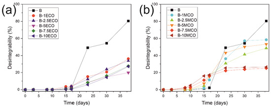 Degree of disintegration under composting conditions expressed as the weight loss as a function of time of (a) PLA–PHB blend and plasticized blend with different ECO content and (b) PLA–PHB blend and plasticized blend with different MCO content.
