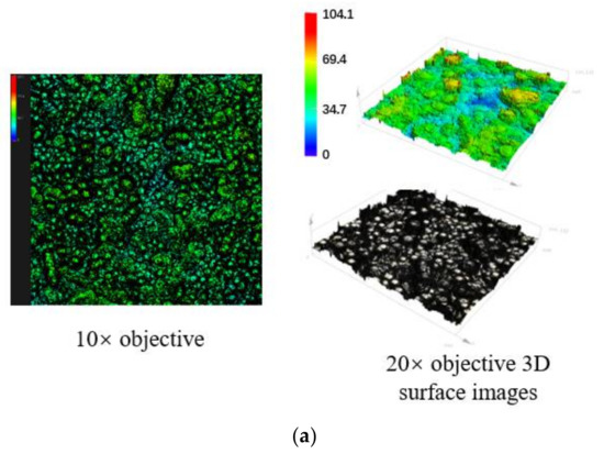 After the friction test, the worn surfaces data and images of two kinds of disc (compound and wear-resistant plate materials) were examined using a three-dimensional morphology observation instrument (Olympus 4500, Japan) to track the sliding trajectory; magnifying the test point at the same position with a 20× objective lens observes the changes in surface morphology before and after the friction test, and the surface wear rate of the mixer chamber wall material was calculated. The calculation of surface morphology test and wear rate test is shown in Equations (1)–(4):
