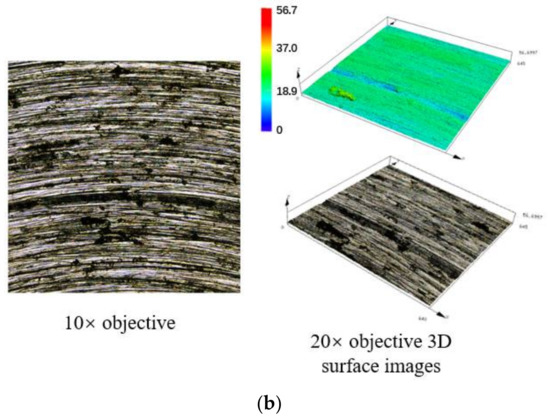 At the same time, it was also found that in the friction test the CMC can absorb some industrial oil on the surface of CB during the friction process. Pan Yiren’s research on friction and wear in the mixing process showed that the residual industrial oil (through the light transmittance experiment of toluene, it can be confirmed that there is an oil film on the surface of the CB particles) on the surface of CB can lubricate and protect the internal mixing chamber wall during the mixing process. Similarly, a comparable phenomenon occurred during the friction between CMC and CB compound during the mixing process in this study, where CMC absorbs the residual industrial oil on the surface of CB. Figure 10 shows the comparison of a before/after friction test of CMC wear-resistant plate, and the surface images of a CB compound sample friction track at the same test time (left: common wear-resistant plate; right: CMC wear-resistant plate). After observing the surface test of the compound after the friction experiment, the test sample surface on the right was relatively smooth, and only a few adhesion and lagging hillock bumps were generated due to the contact between the viscoelastic properties of the rubber and the rigid material; the surface oil was less, showing a dumb state. However, the test sample surface on the left had a lot of obvious adhesion convex and oil.