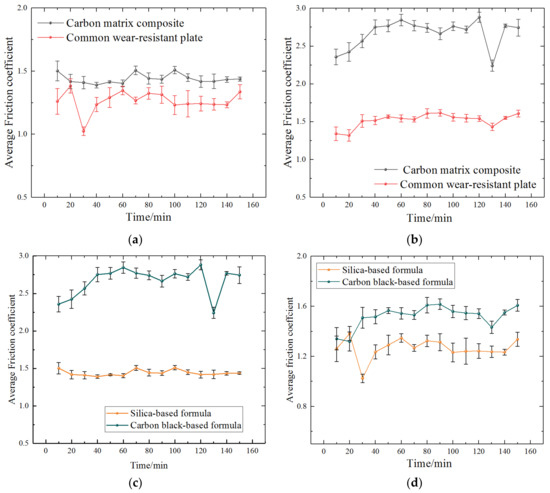 Comparison of average friction coefficient: (a) silica-based formula; (b) carbon black-based formula; (c) carbon matrix composite; (d) common wear-resistant plate.