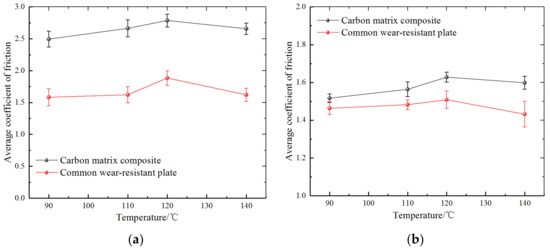 Effect of temperature on friction coefficient of two kinds of wear-resistant materials and two kinds of compound formulations: (a) carbon black-based formula; (b) silica-based formula.