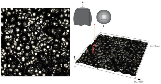 Figure 6 shows the surface wear comparison of two wear-resistance plate materials after the same working time of silica compound mixing. With the increasing working time, after the continuous mixing of silica compound, the surface of CMC wear-resistant plate and common wear-resistant plate appeared to wear, resulting in the change in surface appearance. Combined with the two-dimensional and three-dimensional surface (as shown in Figure 6), it was found that the CMC presented a cylindrical aggregation shape after treatment and the contact surface with the rubber is shown in Figure 7A. The contact mode between CMC wear-resistant plate and silica compound was mainly high–low convex surface contact. Therefore, the wear position is mostly concentrated on the convex surface with large mixing pressure. In the mixing process, wear-resistant plates were located at the front and rear ends of the rotor (internal mixing chamber), and the contact force with the silica compound was mainly affected by the filling coefficient and axial thrust force generated by the rotor on the rubber during the mixing process. When the silica compound entered the wedge-shaped three-dimensional area formed by the rotor, the internal mixing chamber wall and the wear-resistant plate, the increasing force led to the significant wear of the wear-resistant plate. For the common wear-resistant plate, the surface was mainly plane with micro-vertical stripes, which was caused by the heat-treatment process. The contact between silica compound and common wear-resistant plate was mainly surface-to-surface contact, and the large contact area led to larger wear. It was well known that friction behavior was the most important factor in the mixing process. During the mixing process, the friction between fillers or molecular chains would produce the temperature rise, improve the viscous flow state of the compound, and promote the dispersion of fillers. The squeezing friction between mixing components and compound would cause the mutual overlap, rolling and integration of rubber, which can improve the mutual dispersion between rubber and filler and is an important factor to improve the quality of the mixing compound. Comparing the friction coefficient, wear data and surface images, the average friction coefficient between the CMC wear-resistant plate and silica compound was higher than that of the common wear-resistant plate material, while the wear rate was less than that of the common wear-resistant plate material, and the wear rate in each period test time was relatively average. In other words, the friction behavior between silica compound and the wear-resistant plate was mainly composed of adhesion friction, lag friction and particle friction in the mixing process. The larger friction coefficient reflected the stronger friction behavior between compound and the wear-resistant plate. Further, the larger contact force between compound and the wear-resistant plate caused stronger tensile deformation. This tensile deformation was affected by the filler dispersion and the chain connection between silica and rubber after the silica silane coupling, which further explained the advantages of CMC wear-resistant plate in improving the mixing effect. According to the morphology observation, the large tensile deformation was also related to the surface morphology of CMC. The images show that the surface of the CMC presents a micro columnar shape, which likes a uniformly arranged small brush in the mixing process, conducive to rubber long-chain fracture and filler dispersion. At the same time, the small amount of wear indicated that the CMC was more wear-resistant than common wear-resistant plate, which reduced the outflow of rubber or filler along the gap between the rotor and the wear-resistant plate caused by the wear-resistant plate and affected the mixing effect and the quality of rubber products.