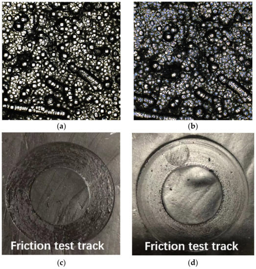 Comparison of surface morphology after friction test (above: carbon matrix composite; below: rubber sample)); (a) Before friction test, (b) After friction test, (c) common wear-resistant plate, (d) carbon matrix composite wear-resistant plate.