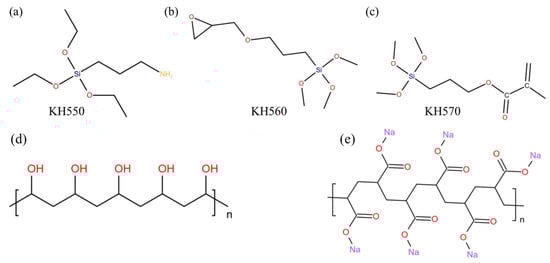 Molecular structure of (a) KH550; (b) KH560; (c) KH570; (d) PVA; (e) PAA-Na.