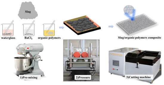 Before the mechanical testing, slag geopolymer paste with and without organic polymers was prepared by a vibration pressure machine at 25 °C according to C109/C109M []. The mixture proportions of slag geopolymer paste incorporating different organic polymers are listed in Table 2. In the experiment, the mass of slag was 4000 g in each group and the mass ratio of water to slag was 0.25. Reference was designed as the control group with no polymer content. Reference1–Reference 4 were mainly used to investigate the effects of the modulus ratio of alkali activator on the mechanical properties of slag-based geopolymer. The concentration of alkali activator remained constant at 6 wt%, respectively, and the modulus ratio of alkali activator was adjusted to 0.8, 1.2, 1.6 and 2.0, respectively. Reference 5–Reference 8 were used to investigate the effects of the concentration of alkali activator on the mechanical properties of slag-based geopolymer. The concentration of the alkali activator was adjusted from 2, 4, 6 to 8 wt% at a constant modulus ratio of the alkali activator according to the strength. The polymer was added at dosages of 1, 3, 5 and 7 wt% of slag to produce the series of geopolymer compositions. The organic polymers were dissolved or mixed into about 30 wt% of water and stirred for 20 min, and BaCl2 as the set retarder was dissolved by the remaining water and stirred for 20 min before adding into the paste. The alkali activator solution, the organic polymer emulsion and the BaCl2 solution were added to the slag and gradually stirred for 1 min with low velocity until a homogeneous slurry was formed, and then the mixture was stirred for 1 min with high velocity. Afterward, the mixture was cast into a 300 × 300 × 25 mm iron mold of the vibration pressure machine shown in Figure 2. The specific height was determined according to the filler content. To mitigate large pores of paste specimens, the mixtures were compacted for 5 min with a vibration pressure of 18HZ. Afterward, the casted specimens were cured by steam curing at 80 °C for 4 h and then cured at 25 °C temperature for an additional 7 and 27 days [,]. The test block of each mixing proportion was cut into 5 pieces with sizes of 250 × 50 × 25 mm by a slicing machine. The compressive strength and flexural strength results were determined by the average of 5 blocks.
