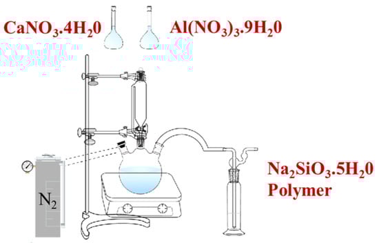 To explore the polymerization mechanism between the organic polymers and C-A-S-H in slag at the microscopic level, C-A-S-H gel was synthesized with the incorporation of different kinds of organic polymers through the direct precipitation method. The Ca/Si ratio and Al/Si ratio was the typical proportioning dose from the literature []. The preparation process of polymer/C-A-S-H was the same as that of the C-A-S-H gel. The polymer concentration was 9.44 g/L. The preparation scheme of polymer/C-A-S-H composite samples is illustrated in Figure 3. The nitrate solution was added into sodium silicate solution dropwise to achieve the desired starting composition. NaOH particles were added to adjust the pH of the synthetic solution near 13 PH. The mixed solution was stirred at 90 rpm for 24 h. During this process, nitrogen was constantly injected into the solution to prevent carbonization. The solids were subjected to three alternating cycles of centrifugation and elution with deionized water. The filtered samples were then dried in a vacuum with a desiccator for 7 days to a constant mass. After that, the filtered samples were ground in an agate mortar and sieved with a 75-micron sieve for the subsequent analyses of FTIR, 29Si NMR, XPS and field emission SEM.