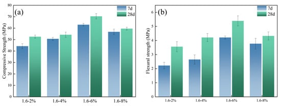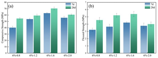 The toughening effect of organic polymers on slag-based geopolymer was examined by the mechanical properties of the hardened paste. The molded sheets were cut into the sizes of 25 × 25 × 25 mm and 250 × 50 × 25 mm for compressive strength and flexural strength, respectively. The modulus ratio of the alkali activator had a remarkable effect on the mechanical properties of the geopolymer. Figure 4 shows the strength of slag-based geopolymer with the different modulus ratios. It can be seen that the compressive and flexural strengths of slag-based geopolymer both increase first and then decrease when the modulus ratio of the alkali activator increases from 0.8 to 2.0. The mechanical properties reach the maximum values when the modulus ratio is 1.6. At this modulus ratio, the compressive and flexural strengths of the specimens after aging for 28 d are, respectively, 70.34 MPa and 5.39 MPa. In the case of lower modulus (SiO2/Na2O) ratios of alkali activator, the increase in modulus ratio leads to more Si ions in the system, which can enhance the degree of polymerization and generate a denser silicon-rich gel phase []. While the modulus ratio increased, the content of Na2O decreased and the dissolution of silicon–aluminum raw materials was less enhanced [].