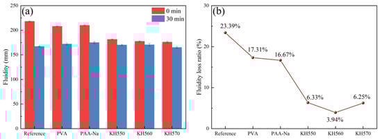 The fluidity (a) and fluidity loss ratio (b) of organic–inorganic composite geopolymer slurry.